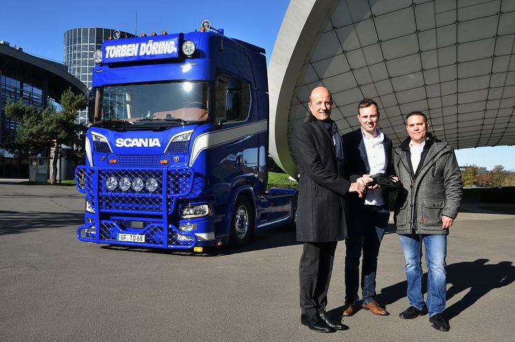 Ende Oktober 2019 wurde erstmals ein Lkw in der Autostadt in Wolfsburg übergeben. Bei dem Fahrzeug handelt es sich um einen Scania S 580 mit V8-Motor für die Spedition Torben Döring aus Flettmar. Lars Rehberg, Verkauf Neufahrzeuge Scania, und Stephan de Haar, Leiter Erlebniswelten der Autostadt, übergaben symbolisch den Schlüssel an Torben Döring, Geschäftsführer der Spedition.