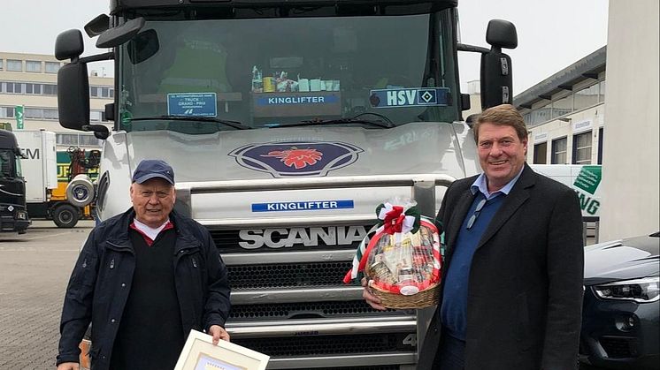 Umso beeindruckender ist es, dass der Unternehmer inzwischen 2 Millionen Kilometer mit seinem Lkw gefahren ist. „Ohne nennenswerte Störungen“, bestätigt Harald Meier, der den Hauber damals von Klaus Stemmler, Key Account Manager bei Scania Hamburg, gekauft hatte. „Auch für mich ist es eine Besonderheit, einem Kunden eine Urkunde für zwei Millionen gefahrene Kilometer zu überreichen, der noch heute mit seinem Scania und seiner überragenden Fahrleistung so zufrieden ist.“