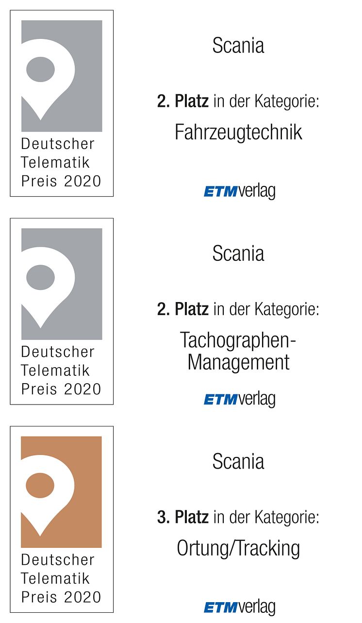 Die gute Performance der Scania Telematik hat auch das Abschneiden beim Deutschen Telematik Preis 2020 bestätigt. Einen 2. Platz erzielte Scania sowohl in der Kategorie Tachographen-Management als auch in der Kategorie Fahrzeugtechnik. Bei der Bewertung von Ortung und Tracking kam Scania Telematik auf Platz 3 – und war in den genannten Kategorien immerhin als einziger Nutzfahrzeughersteller unter den Top 3 vertreten.