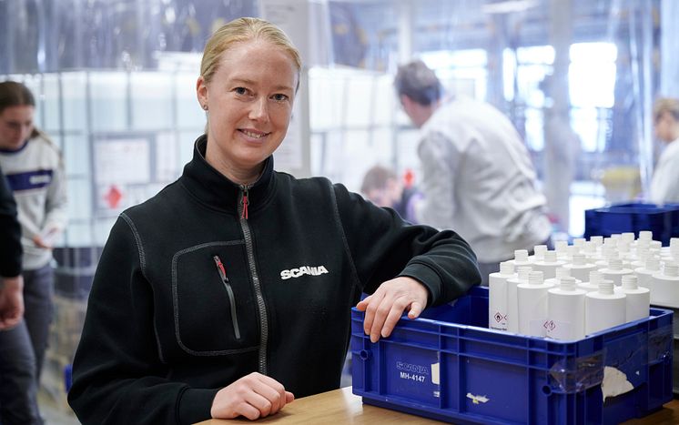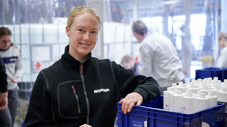 Neben ihnen beklebt ein weiteres Team die kleinen Flaschen mit Etiketten, die bei Scania gedruckt werden, bevor ein drittes Team die Flaschen in Kisten verpackt. Diese werden sofort in die Krankenhäuser in der Region Stockholm transportiert. „Sie rufen die ganze Zeit an, dass das Desinfektionsmittel zur Neige geht. Die Transporte laufen kontinuierlich weiter", sagt Malin Malmbrandt, Standortleiterin für Cummins/Scania XPI (DI). Sie hat eine Liste mit etwa 50 freiwilligen Scania Mitarbeitern, die abwechselnd die mobile Anlage für Handdesinfektionsmittel besetzen.