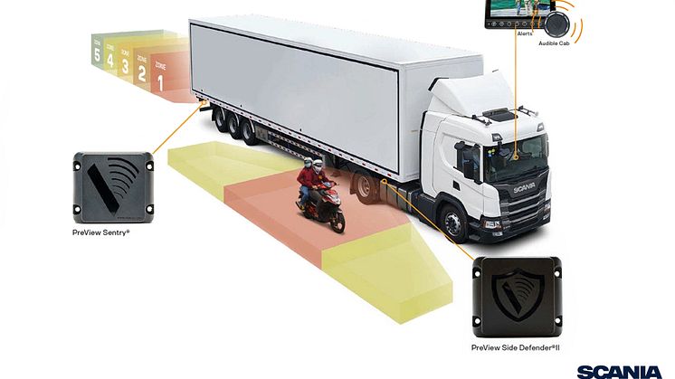 Zahlreiche Sicherheitsfeatures von Scania bieten akustische und visuelle Warnungen im Fahrerhaus, die im Straßenverkehr Leben retten können. Das neue Set bestehend aus dem Scania PreView Sentry Radar und Scania Side Defender II kombiniert nun einen Abbiege- und Rückfahrassistenten, um für eine verstärkte Sicherheit im Straßenverkehr zu sorgen.