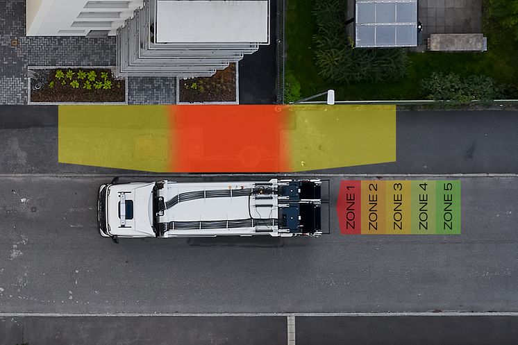 Wenn sich Personen oder Objekte in der Reverse Detection Zone des Fahrzeugs befinden, leuchten die unteren LEDs des Displays. Sollte sich ein Objekt im toten Winkel befinden, leuchten die seitlichen LEDs. Für beide Zonen gibt es unterschiedliche akustische Signale. Zusätzlich können Kamerasysteme für eine noch bessere Sicht aus dem Fahrerhaus nachgerüstet werden.