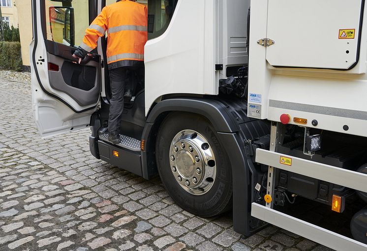 Die L-Baureihe von Scania ist mit einer automatischen Absenkfunktion und einer 44 cm breiten Einstiegsstufe ausgestattet. Abgesehen davon, dass sie niedrig ist, ist die Einstiegsstufe noch dazu breit und erleichtert so das oftmalige Ein- und Aussteigen aus dem Fahrerhaus.
