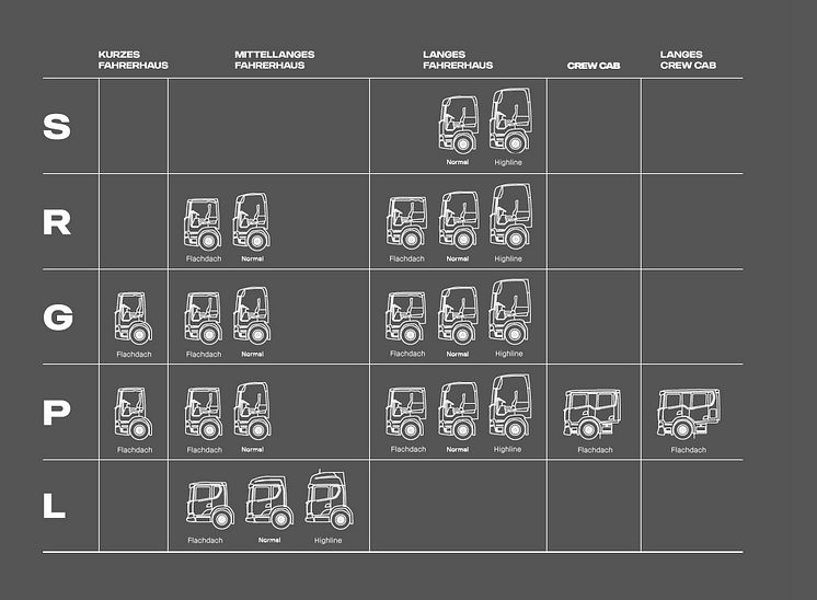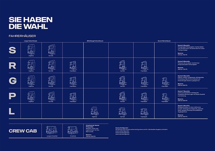 Die neue Lkw-Generation von Scania umfasst nun 24 Fahrerhausvarianten, die in fünf unterschiedliche Baureihen unterteilt werden können. Die jüngsten Neuzugänge sind dabei die Fahrerhäuser der L‑Baureihe und die Mannschaftsfahrerhäuser der P-Baureihe.