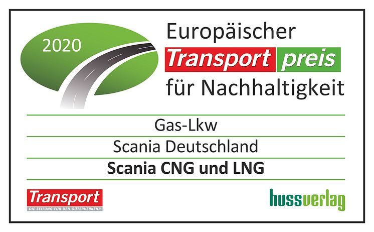 Scania Gas-Lkw wurden mit dem Europäischen Transportpreis für Nachhaltigkeit 2020 ausgezeichnet. Vergeben wird der Preis von der Zeitung Transport zusammen mit dem Huss-Verlag. Schon 2017 erhielt Scania diese Auszeichnung für das Fahrerassistenzsystem Scania CCAP mit „Pulse & Glide“.