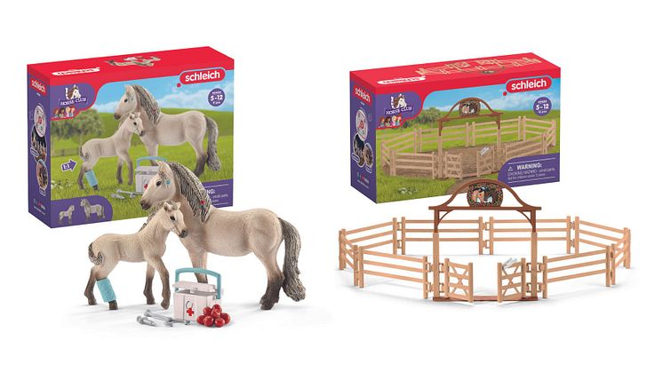 Die nächste Überraschung finde ich, nimmt sich das Löwenkopfkaninchen vor und hüpft durch die offene Terrassentür in den Garten. Ein Wiehern hinter den ersten Osterglocken verrät das nächste Versteck. Das Löwenkopfkaninchen lugt hinter die gelben Blumen und entdeckt eine Pferdekoppel mit Eingangstor. Eine Isländer-Stute und ihr frisch geborenes Fohlen genießen hier die frische Luft und das leckere Gras. Um zu sehen, ob es dem kleinen Fohlen gut geht, steht Hannahs Erste-Hilfe-Set schon bereit. Hannah möchte nämlich Tierärztin werden und in die Fußstapfen ihrer Mama treten. Nach einer kurzen Untersuchung mit ihrem Stethoskop tätschelt sie die beiden und gibt ihnen zur Belohnung einen saftigen Apfel. Pferdefans können sich an Ostern über diese beiden Spielsets im 2-in-1 HORSE CLUB Set freuen.