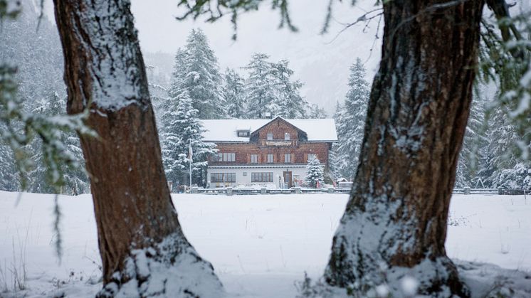 Das alte Holzhaus aus dem 18. Jahrhundert liegt im Sapüner Tal, oberhalb von Langwies. Das Berggasthaus mit neun Zimmern und einer großen Gruppenunterkunft bietet eine gelungene Mischung aus rustikalem Komfort und urigem Bergcharme in zauberhafter Winterlandschaft. Ab Langwies erreicht man das Berghotel zu Fuß in unter zwei Stunden. Alternativ holen einen die Gastgeber mit dem Schneemobil ab. Für den Rückweg ins Tal kann man Schlitten mieten.