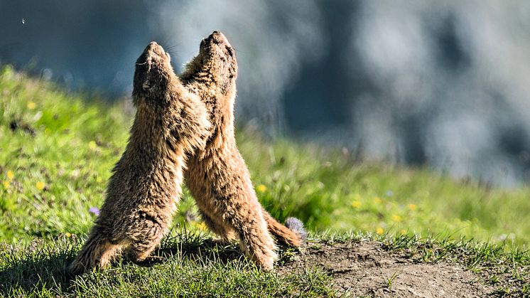 Die mehrstimmigen Pfiffe der Murmeltiere sind fast auf jeder Wanderung über die Schweizer Berge zu hören. Mit den Pfiffen teilen sie mit, dass von den eindringenden Wanderinnen und Wanderern keine Gefahr ausgeht. Aber bekommen Bergreisende die Nagetiere auch irgendwo zu Gesicht? Das Gangsystem, in das die Murmeltierfamilie bei Gefahr verschwindet, ist an den kleinen Erdhügeln in der Bergmatte zu erkennen. Im Sommer ist die beste Zeit, um nach den Tieren Ausschau zu halten, denn in der kalten Jahreszeit halten sie Winterschlaf. Um die pfiffigen Tierchen in freier Natur erspähen zu können, heißt es ganz still sein und die Augen offenhalten. In Graubünden auf dem Lehrpfad in Avers-Juppa lernen Besucher an elf Stationen alles Wissenswerte über das Alpenmurmeltier.