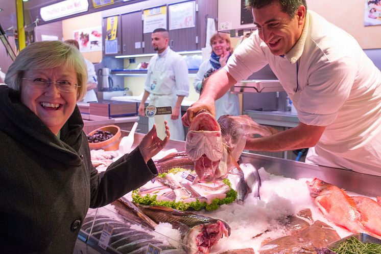 Elisabeth Aspaker zu Besuch bei Fisch Schloh auf dem Isemarkt in Hamburg-Eppendorf anlässlich der Eröffnung der Skrei-Saison