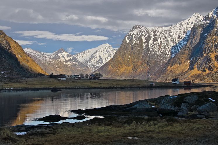 Einzigartiger Blick auf den Fjord in Hennignsvaer umrahmt von hohen Berge schneebedeckt
