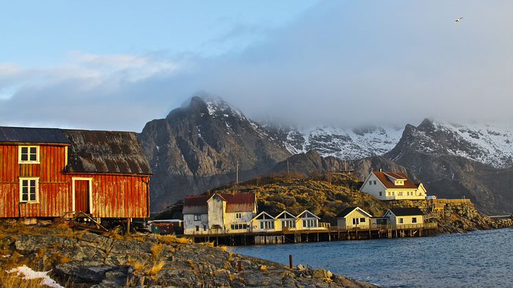 Einzigartiger Blick auf den Fjord in Hennignsvaer umrahmt von hohen Berge schneebedeckt