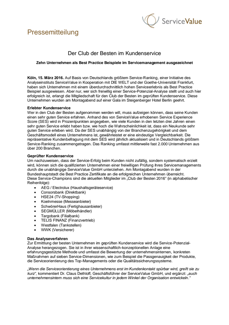 Auf Basis von Deutschlands größtem Service-Ranking, einer Initiative von ServiceValue in Kooperation mit DIE WELT und der Goethe-Universität Frankfurt, haben sich Unternehmen mit einem überdurchschnittlichen Serviceerlebnis als Best Practice Beispiel ausgewiesen. Aber nur, wer sich freiwillig und erfolgreich einer Service-Potenzial-Analyse stellt, erlangt die Mitgliedschaft im Club der Besten.