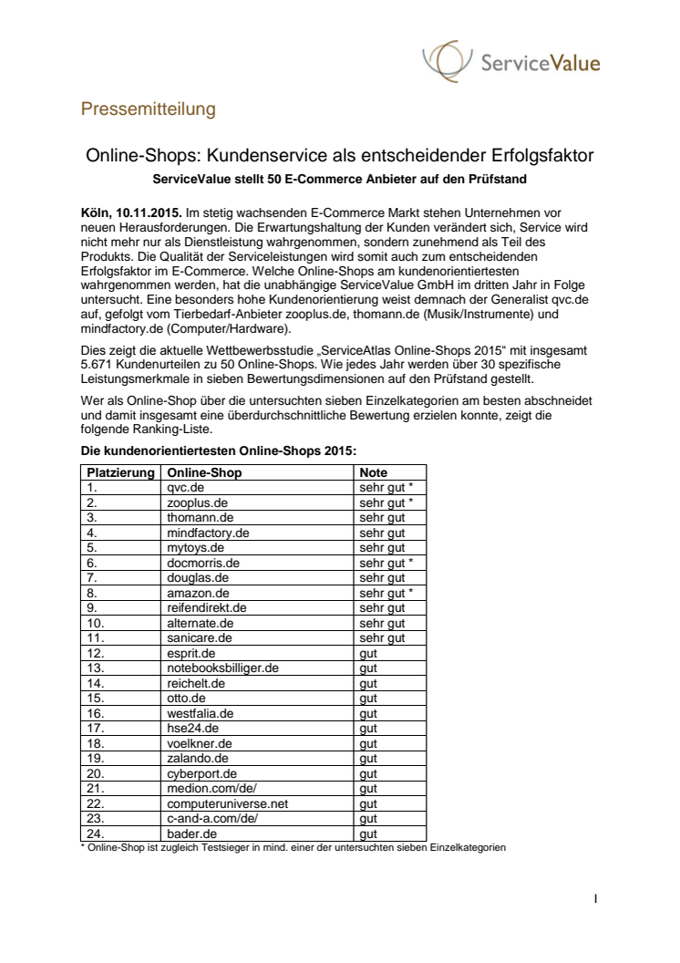 Im stetig wachsenden E-Commerce Markt stehen Unternehmen vor neuen Herausforderungen. Die Erwartungshaltung der Kunden verändert sich, Service wird nicht mehr nur als Dienstleistung wahrgenommen, sondern zunehmend als Teil des Produkts. Welche Online-Shops am kundenorientiertesten wahrgenommen werden, hat die unabhängige ServiceValue GmbH im dritten Jahr in Folge untersucht.