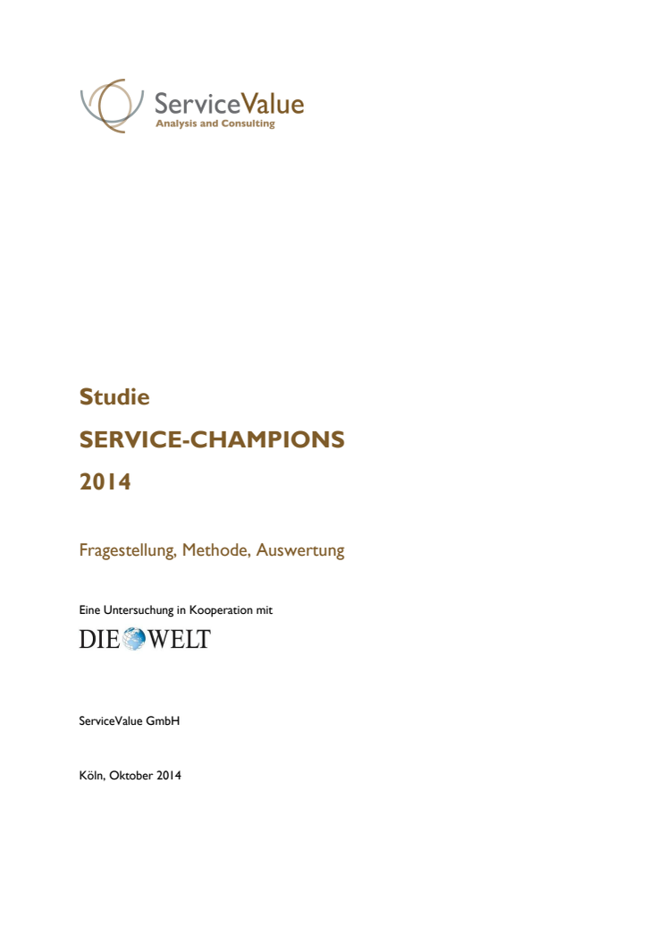 Die ServiceValue GmbH hat 2014 zum vierten Mal in Folge das größte Service-Ranking Deutschlands, die „Service-Champions“, ermittelt. Insgesamt wurden 1.519 Unternehmen und 188 Branchen aus Kundensicht bewertet.