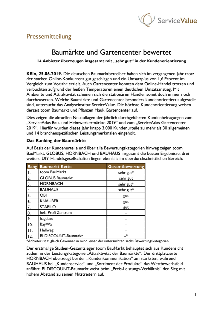 Der 174-seitige „ServiceAtlasBau- und Heimwerkermärkte 2019“ sowie der 321-seitige „ServiceAtlas Gartencenter 2019“ umfassen Benchmarks und Individualprofile zu 12 Baumarkt-Ketten bzw. 32 Gartencentern. Beide Studien können über die ServiceValue GmbH bezogen werden.