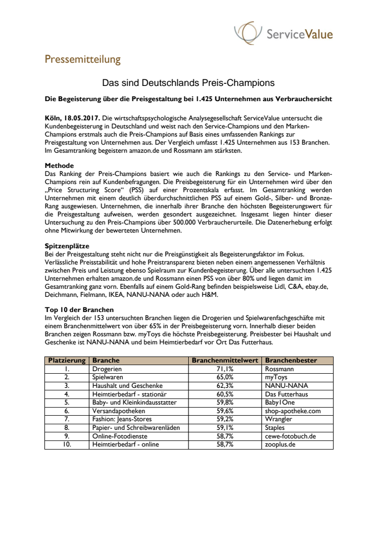 Die wirtschaftspsychologische Analysegesellschaft ServiceValue untersucht die Kundenbegeisterung in Deutschland und weist nach den Service-Champions und den Marken-Champions erstmals auch die Preis-Champions auf Basis eines umfassenden Rankings zur Preisgestaltung von Unternehmen aus. Der Vergleich umfasst 1.425 Unternehmen aus 153 Branchen. Im Gesamtranking begeistern amazon.de und Rossmann am stärksten.