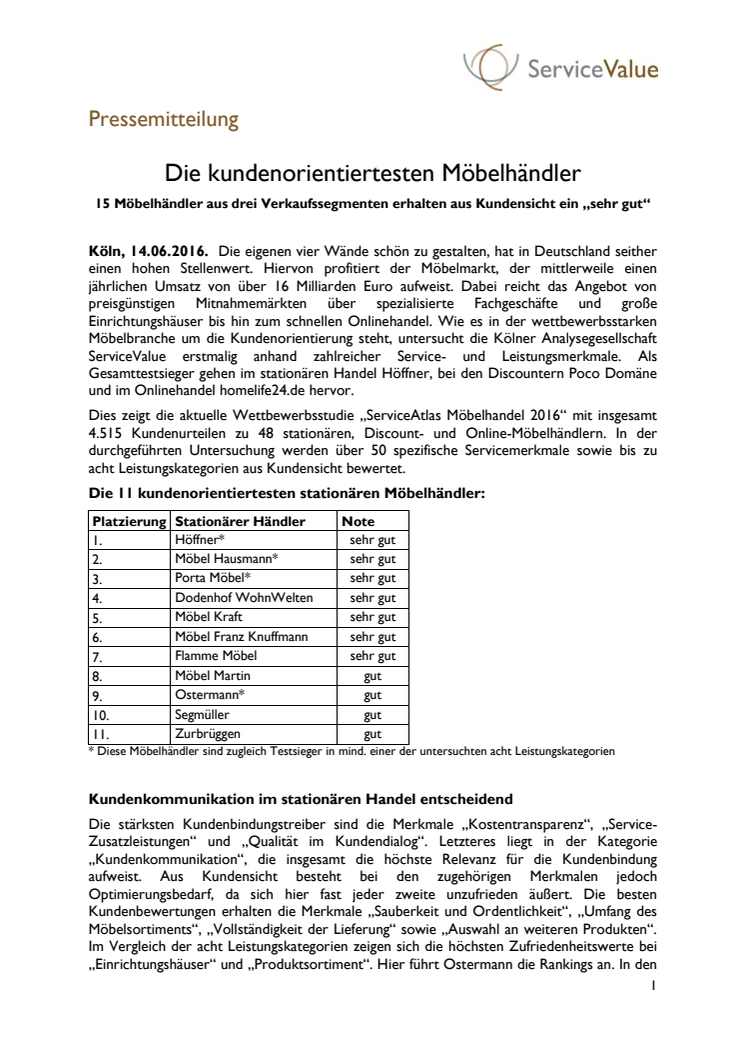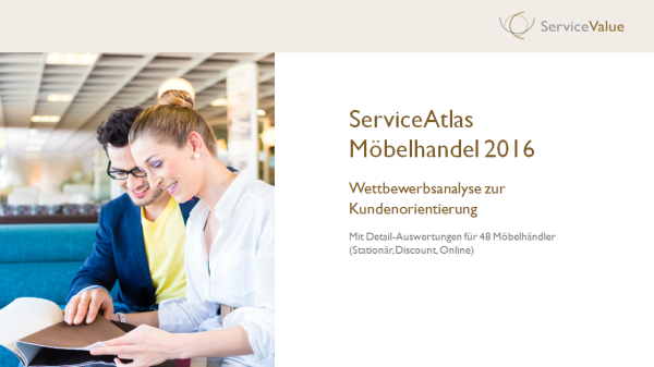 Der über 720-seitige „ServiceAtlas Möbelhandel 2016“ kann über die ServiceValue GmbH bezogen werden. Die Wettbewerbsstudie enthält Rankings sowie detaillierte Einzelprofile zu 48 Möbelhändlern (Stationär, Discounter, Online).