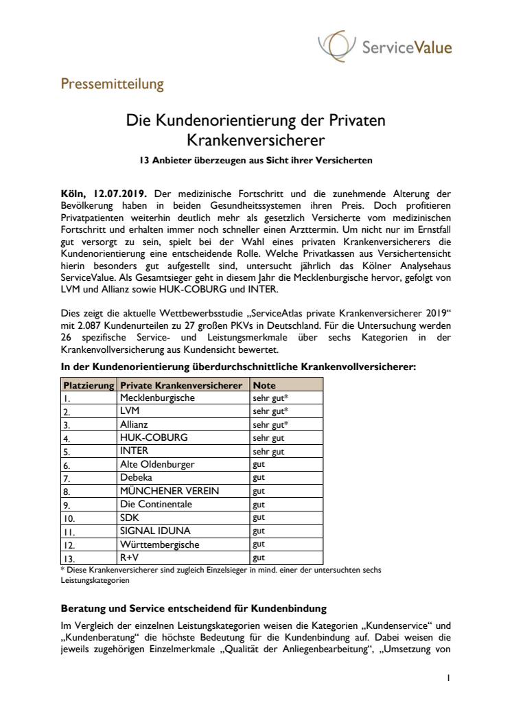 Der über 240-seitige „ServiceAtlas Private Krankenversicherer 2019“ kann über die ServiceValue GmbH bezogen werden. Die Wettbewerbsstudie enthält Rankings sowie detaillierte Einzelprofile zu 27 großen privaten Krankenversicherern: Allianz, Alte Oldenburger, ARAG, AXA, Barmenia, Bayrische Beamtenkrankenkasse, Central, Debeka, Deutscher Ring, Die Continentale, DKV, Gothaer, Hallesche, HanseMerkur, HUK-COBURG, INTER, LKH, LVM, Mecklenburgische, Münchener Verein, Nürnberger, R+V, SDK, SIGNAL IDUNA, UKV, uniVersa und Württembergische.