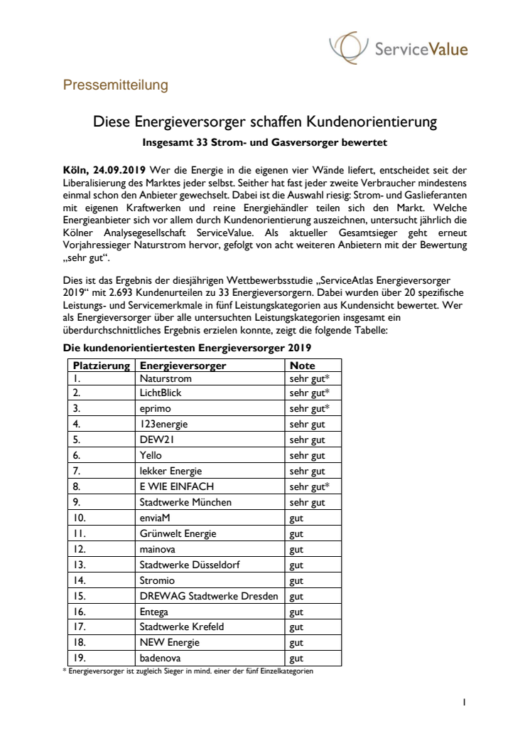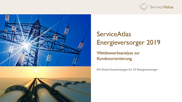 Der 328-seitige „ServiceAtlas Energieversorger 2019“ kann über die ServiceValue GmbH bezogen werden. Die Wettbewerbsstudie enthält Rankings sowie detaillierte Einzelprofile zu 33 Energieversorgern: 123energie, badenova, DEW21, DREWAG Stadtwerke Dresden, E WIE EINFACH, E.ON, EnBW, enercity, ENSO, Entega, enviaM, eprimo, EWE, ExtraEnergie, Grünwelt Energie, innogy, lekker Energie, LichtBlick, mainova, MVV Energie, Naturstrom, N-ERGIE, NEW Energie, RheinEnergie, Stadtwerke Duisburg, Stadtwerke Düsseldorf, Stadtwerke Krefeld, Stadtwerke Leipzig, Stadtwerke München, Stromio, Süwag, Vattenfall, Yello.