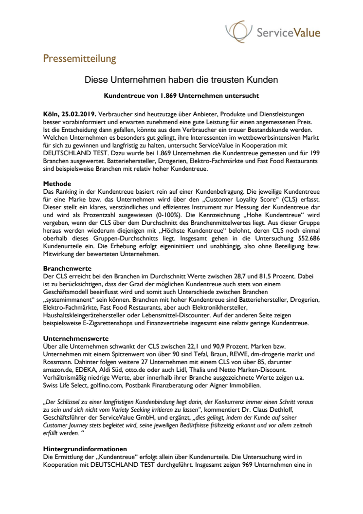 Die Ermittlung der „Kundentreue“ erfolgt allein über Kundenurteile. Die Untersuchung wird in Kooperation mit DEUTSCHLAND TEST durchgeführt. Insgesamt zeigen 969 Unternehmen eine in Bezug auf ihre Branche hohe bzw. höchste Kundentreue. Die kompletten Rankings finden Sie unter: http://kundentreue.servicevalue.de