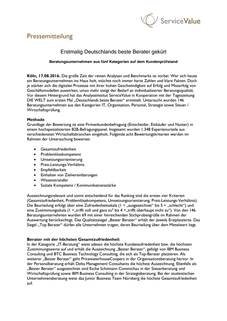 Die große Zeit der reinen Analysen und Benchmarks ist vorbei. Wer sich heute ein Beratungsunternehmen ins Haus holt, möchte noch immer harte Zahlen und klare Fakten. Doch je stärker sich die digitalen Prozesse mit ihrer hohen Geschwindigkeit auf Erfolg und Misserfolg von Geschäftsmodellen auswirken, umso mehr steigt der Bedarf an individualisierter Beratungsqualität. Vor diesem Hintergrund hat das Analyseinstitut ServiceValue in Kooperation mit der Tageszeitung DIE WELT zum ersten Mal „Deutschlands beste Berater“ ermittelt. Untersucht wurden 146 Beratungsunternehmen aus den Kategorien IT, Organisation, Personal, Strategie sowie Steuer / Wirtschaftsprüfung.