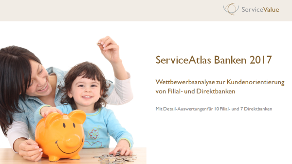 Die über 250-seitige Wettbewerbsstudie „ServiceAtlas Banken 2017“ kann über die ServiceValue GmbH bezogen werden. Die Studie enthält ausführliche Gesamtergebnisse sowie detaillierte Einzelprofile zu 17 Banken, darunter zehn Filialbanken und sieben Direktbanken.