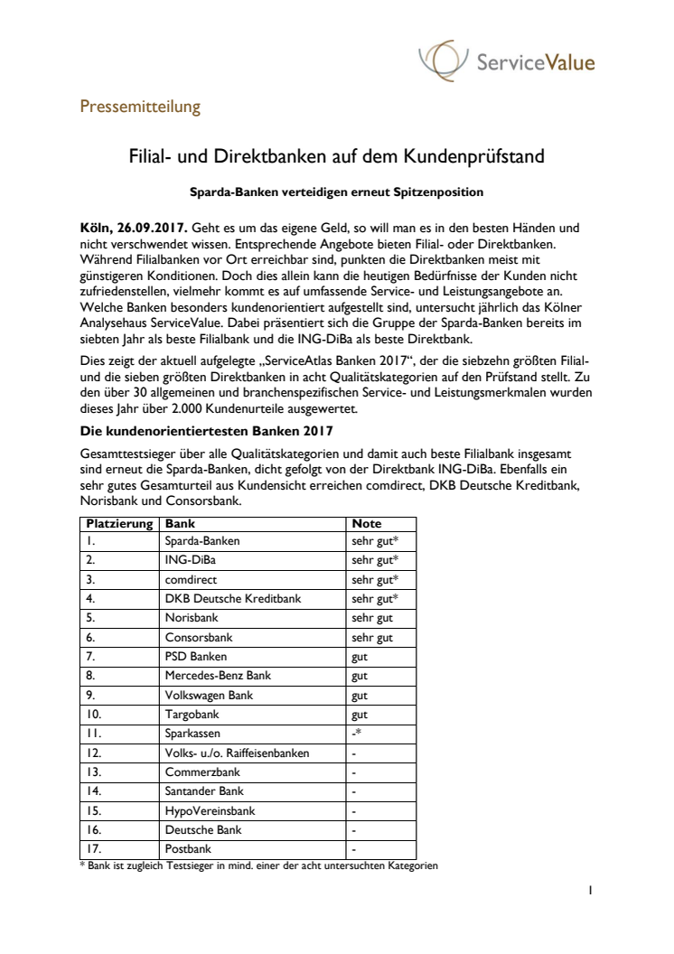 Geht es um das eigene Geld, so will man es in den besten Händen und nicht verschwendet wissen. Entsprechende Angebote bieten Filial- oder Direktbanken. Während Filialbanken vor Ort erreichbar sind, punkten die Direktbanken meist mit günstigeren Konditionen. Doch dies allein kann die heutigen Bedürfnisse der Kunden nicht zufriedenstellen, vielmehr kommt es auf umfassende Service- und Leistungsangebote an. Welche Banken besonders kundenorientiert aufgestellt sind, untersucht jährlich das Kölner Analysehaus ServiceValue. Dabei präsentiert sich die Gruppe der Sparda-Banken bereits im siebten Jahr als beste Filialbank und die ING-DiBa als beste Direktbank.