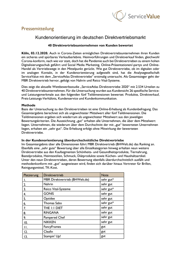 Die Ermittlung zur Kundenorientierung im Direktvertrieb erfolgt allein über Kundenurteile. Der über 380-seitige Berichtsband „ServiceAtlas Direktvertriebe 2020“ kann über die ServiceValue GmbH bezogen werden. Die Wettbewerbsstudie enthält Rankings sowie detaillierte Einzelprofile zu 40 Direktvertriebsunternehmen. Untersuchung und Auszeichnung werden in Kooperation mit dem Süddeutschen Verlag durchgeführt.