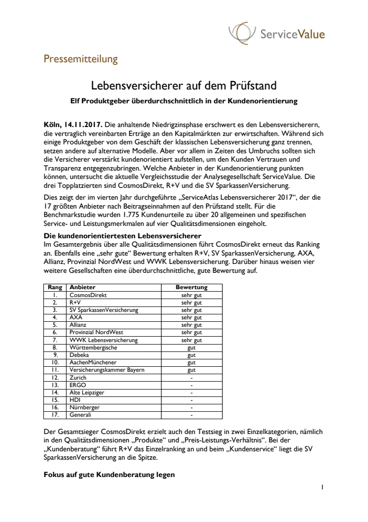 Die anhaltende Niedrigzinsphase erschwert es den Lebensversicherern, die vertraglich vereinbarten Erträge an den Kapitalmärkten zur erwirtschaften. Während sich einige Produktgeber von dem Geschäft der klassischen Lebensversicherung ganz trennen, setzen andere auf alternative Modelle. Aber vor allem in Zeiten des Umbruchs sollten sich die Versicherer verstärkt kundenorientiert aufstellen, um den Kunden Vertrauen und Transparenz entgegenzubringen. Welche Anbieter in der Kundenorientierung punkten können, untersucht die aktuelle Vergleichsstudie der Analysegesellschaft ServiceValue. Die drei Topplatzierten sind CosmosDirekt, R+V und die SV SparkassenVersicherung.