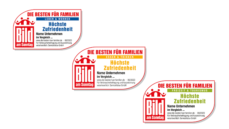 Bei Konsumentscheidungen bevorzugen Familien solche Anbieter, die ihren besonderen Anforderungen und Wünschen am besten gerecht werden. Mit welchen Unternehmen sich Familien besonders zufrieden zeigen, hat die ServiceValue GmbH in Kooperation mit der BILD am SONNTAG für ihre aktuelle Studie „Die Besten für Familien“ untersucht. Darin wird anhand von über 100.000 Kunden- und Nutzerurteilen über 545 Unternehmen aus 43 Branchen ermittelt, welche Anbieter als besonders gut für Familien gelten.