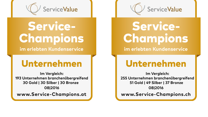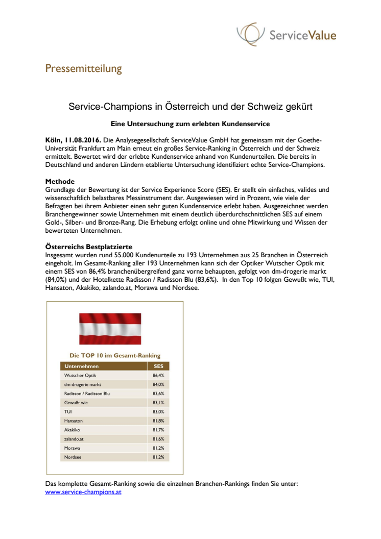 Die Analysegesellschaft ServiceValue GmbH hat gemeinsam mit der Goethe-Universität Frankfurt am Main erneut ein großes Service-Ranking in Österreich und der Schweiz ermittelt. Bewertet wird der erlebte Kundenservice anhand von Kundenurteilen. Die bereits in Deutschland und anderen Ländern etablierte Untersuchung identifiziert echte Service-Champions.