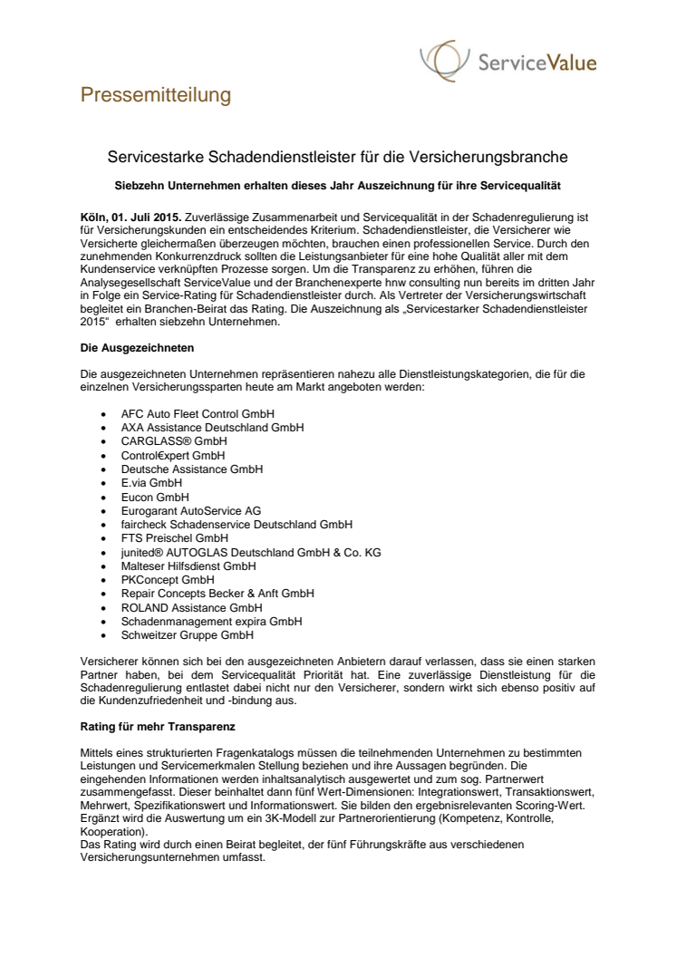 Zuverlässige Zusammenarbeit und Servicequalität in der Schadenregulierung ist für Versicherungskunden ein entscheidendes Kriterium. Schadendienstleister, die Versicherer wie Versicherte gleichermaßen überzeugen möchten, brauchen einen professionellen Service. Durch den zunehmenden Konkurrenzdruck sollten die Leistungsanbieter für eine hohe Qualität aller mit dem Kundenservice verknüpften Prozesse sorgen. Um die Transparenz zu erhöhen, führen die Analysegesellschaft ServiceValue und der Branchenexperte hnw consulting nun bereits im dritten Jahr in Folge ein Service-Rating für Schadendienstleister durch. Als Vertreter der Versicherungswirtschaft begleitet ein Branchen-Beirat das Rating. Die Auszeichnung als „Servicestarker Schadendienstleister 2015“ erhalten siebzehn Unternehmen.