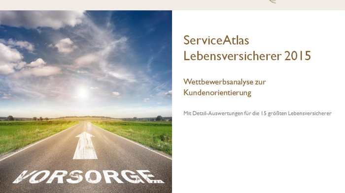 Die 116-seitige Wettbewerbsstudie „ServiceAtlas Lebensversicherer 2015“ kann über die ServiceValue GmbH bezogen werden. Die Studie enthält ausführliche Gesamtergebnisse sowie detaillierte Einzelprofile zu den 15 größten Lebensversicherern.