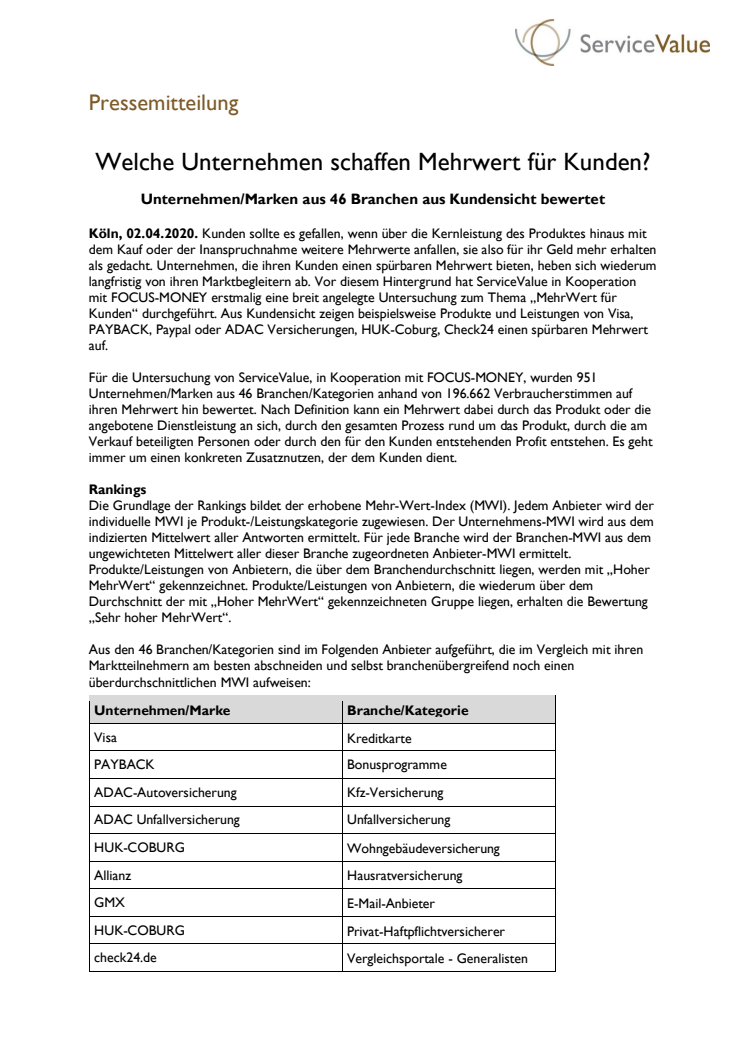Kunden sollte es gefallen, wenn über die Kernleistung des Produktes hinaus mit dem Kauf oder der Inanspruchnahme weitere Mehrwerte anfallen, sie also für ihr Geld mehr erhalten als gedacht. Unternehmen, die ihren Kunden einen spürbaren Mehrwert bieten, heben sich wiederum langfristig von ihren Marktbegleitern ab. Vor diesem Hintergrund hat ServiceValue in Kooperation mit FOCUS-MONEY erstmalig eine breit angelegte Untersuchung zum Thema „MehrWert für Kunden“ durchgeführt. Aus Kundensicht zeigen beispielsweise Produkte und Leistungen von Visa, PAYBACK, Paypal oder ADAC Versicherungen, HUK-Coburg, Check24 einen spürbaren Mehrwert auf.