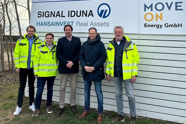 Bereits seit Ende März speist der Solarpark in Witznitz wie geplant tagtäglich 605 Megawatt grünen Strom ins Netz. Europas größter zusammenhängender Solarpark ist im Besitz der SIGNAL IDUNA-Tochter HANSAINVEST Real Assets (HIRA). Über die Gesamtinbetriebnahme freuten sich (v.l): Florian Pielmaier, Projektleiter Moveon Energy, Steffen Montag, Geschäftsführer Moveon Energy, Oliver Marquordt, Senior Portfolio Manager HIRA, Christoph Lüken, Geschäftsführer HIRA, Wolfgang Pielmaier, Technischer Leiter Moveon Energy
