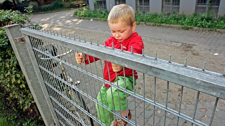 Junge klettert am Gitterzaun, Querformat