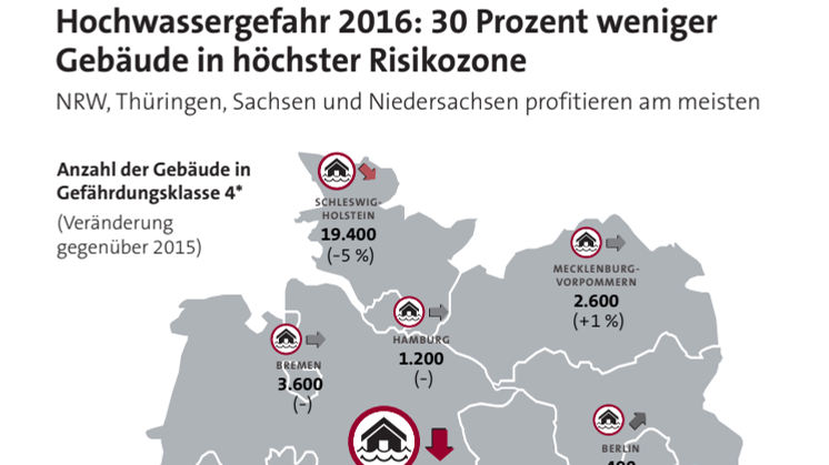 Mit dem aktuellen Update der Datenbank für Hochwassergefahren, ZÜRS Geo, werden nur noch 139.000 Häuser in die höchste Gefahrenklasse 4 eingeordnet. Im Vorjahr waren es noch 197.000 von bundesweit mehr als 21 Millionen Adressen. Damit liegen nur 0,7 Prozent aller Gebäude in der Zone 4, in der statistisch mindestens ein Hochwasser in zehn Jahren zu erwarten ist.