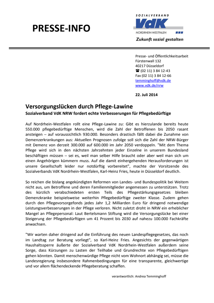 Auf NRW rollt eine Pflege-Lawine zu: Gibt es hierzulande bereits heute 550.000 Pflegebedürftige, wird die Zahl der Betroffenen bis 2050 rasant ansteigen - auf etwa 930.000. Insbesondere die Zahl der NRW-Bürger mit Demenz wird sich von derzeit 300.000 auf voraussichtlich 600.000 im Jahr 2050 verdoppeln. Auf die damit einhergehenden Herausforderungen sind wir aus Sicht des VdK NRW nicht vorbereitet.