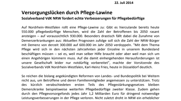 "Wir warten daher dringend auf die Einführung des neuen Landespflegegesetzes, das noch im Landtag zur Beratung vorliegt", so Karl-Heinz Fries. Angesichts der gegenwärtigen Haushaltssperre äußerte der Sozialverband VdK Nordrhein-Westfalen außerdem seine Sorge, dass Kürzungen zu Lasten der Teilhabe und Grundrechte von Pflegebedürftigen gehen könnten. Damit menschenwürdige Pflege nicht vom Wohnort abhängig sei, müsse die Landesregierung insbesondere Rahmenbedingungen für eine transparente, gleichwertige und vor allem flächendeckende Pflegeberatung schaffen.
