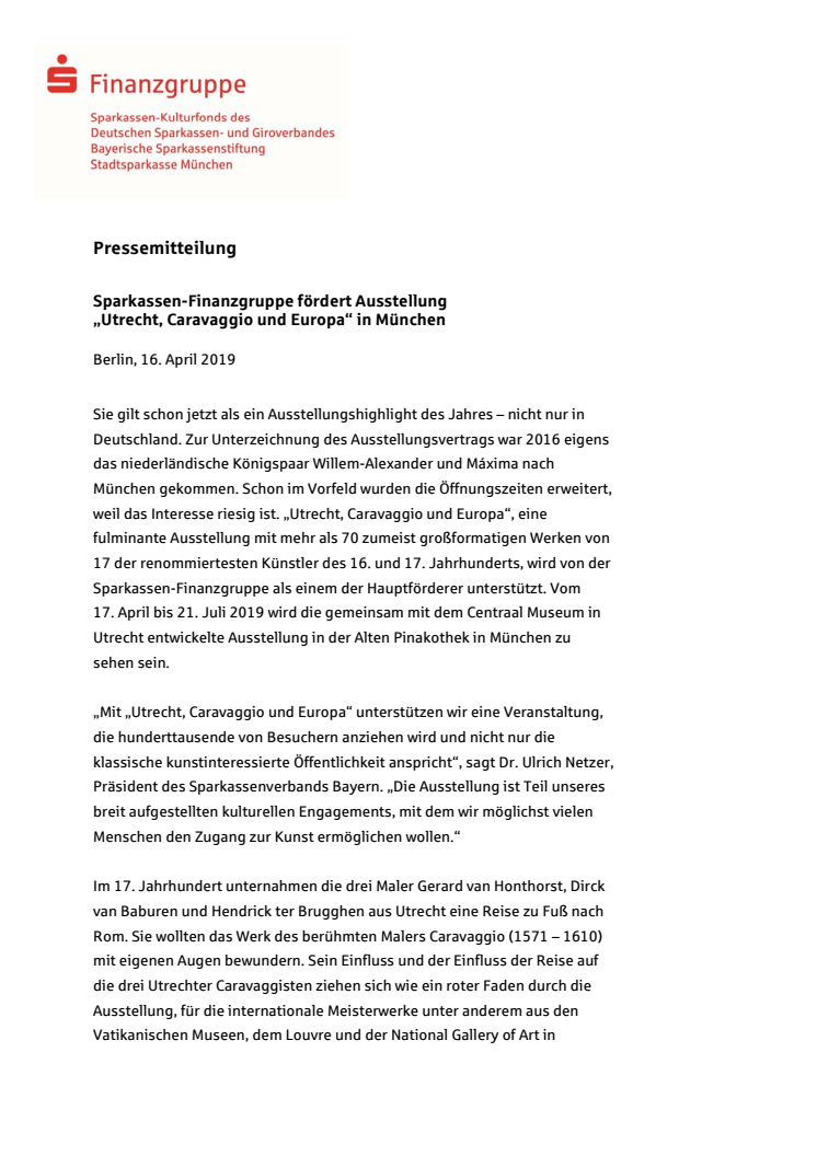 Sparkassen-Finanzgruppe fördert Ausstellung „Utrecht, Caravaggio und Europa“ in München