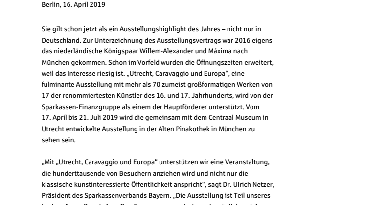 „Mit „Utrecht, Caravaggio und Europa“ unterstützen wir eine Veranstaltung, die hunderttausende von Besuchern anziehen wird und nicht nur die klassische kunstinteressierte Öffentlichkeit anspricht“, sagt Dr. Ulrich Netzer, Präsident des Sparkassenverbands Bayern. „Die Ausstellung ist Teil unseres breit aufgestellten kulturellen Engagements, mit dem wir möglichst vielen Menschen den Zugang zur Kunst ermöglichen wollen.“