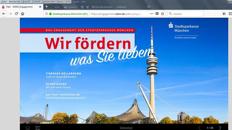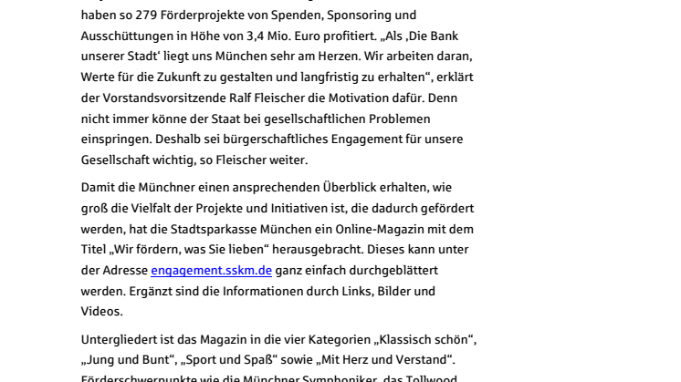 Damit die Münchner einen ansprechenden Überblick erhalten, wie groß die Vielfalt der Projekte und Initiativen ist, die dadurch gefördert werden, hat die Stadtsparkasse München ein Online-Magazin mit dem Titel „Wir fördern, was Sie lieben“ herausgebracht. Dieses kann unter der Adresse engagement.sskm.de ganz einfach durchgeblättert werden. Ergänzt sind die Informationen durch Links, Bilder und Videos.