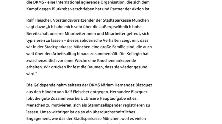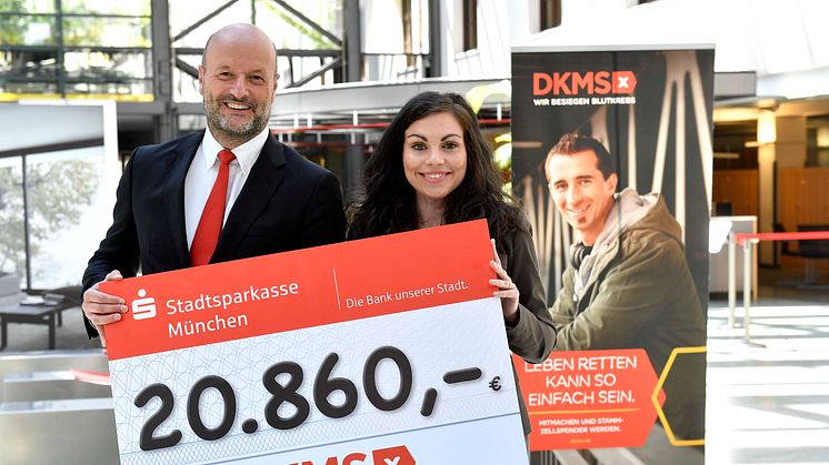 Die Geldspende nahm seitens der DKMS Miriam Hernandez Blazquez aus den Händen von Ralf Fleischer entgegen. Hernandez Blazquez lobt die gute Zusammenarbeit: „Unsere Hauptaufgabe ist es, Menschen zu motivieren, sich als Stammzellspender registrieren zu lassen. Umso wichtiger ist da so ein überdurchschnittliches Engagement, wie das der Stadtsparkasse München, weil es vielen Menschen eine zweite Lebenschance ermöglichen könnte. Es wäre schön, wenn viele Unternehmen diesem Beispiel folgen würden.“