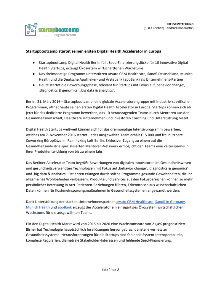 Startupbootcamp Digital Health Berlin füllt Seed-Finanzierungslücke für 10 innovative Digital Health Startups. Das dreimonatige Programm unterstützen arvato CRM Healthcare, Sanofi Deutschland, Munich Health und der Deutschen Apotheker- und Ärztebank (apoBank). Heute startet die Bewerbungsphase für Startups mit Fokus auf ‚behavior change’, ‚diagnostics & genomics’, ‚big data & analytics’.