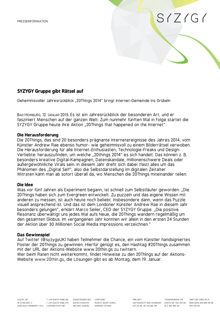 Es ist ein Jahresrückblick der besonderen Art, und er fasziniert Menschen auf der ganzen Welt: Zum nunmehr fünften Mal in Folge startet die SYZYGY Gruppe heute ihre Aktion „20Things that happened on the Internet“.