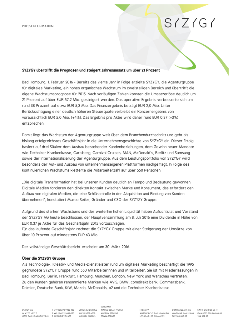 Bereits das vierte Jahr in Folge erzielte SYZYGY, die Agenturgruppe für digitales Marketing, ein hohes organisches Wachstum im zweistelligen Bereich und übertrifft die eigene Wachstumsprognose für 2015. Nach vorläufigen Zahlen konnten die Umsatzerlöse deutlich um 21 Prozent auf über EUR 57,2 Mio. gesteigert werden.