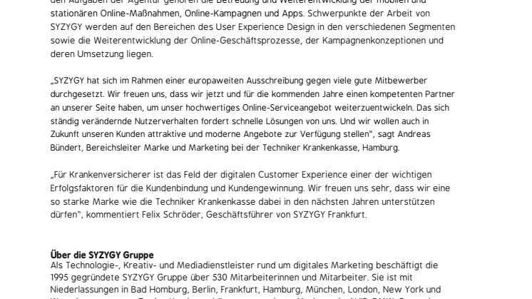 Nach einer öffentlichen Ausschreibung konnte das Frankfurter Büro der Digitalagentur SYZYGY den Online-Etat der Techniker Krankenkasse, Hamburg, gewinnen. Zu den Aufgaben der Agentur gehören die Betreuung und Weiterentwicklung der mobilen und stationären Online-Maßnahmen, Online-Kampagnen und Apps. Schwerpunkte der Arbeit von SYZYGY werden auf den Bereichen des User Experience Design in den verschiedenen Segmenten sowie die Weiterentwicklung der Online-Geschäftsprozesse, der Kampagnenkonzeptionen und deren Umsetzung liegen.