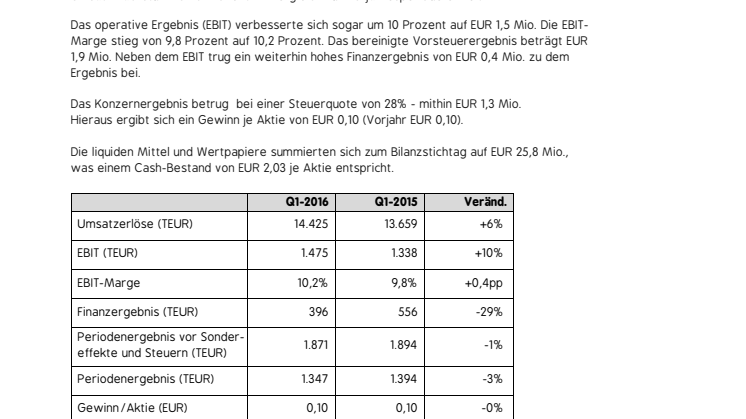 Das operative Ergebnis (EBIT) verbesserte sich sogar um 10 Prozent auf EUR 1,5 Mio. Die EBIT-Marge stieg von 9,8 Prozent auf 10,2 Prozent. Das bereinigte Vorsteuerergebnis beträgt EUR 1,9 Mio. Neben dem EBIT trug ein weiterhin hohes Finanzergebnis von EUR 0,4 Mio. zu dem Ergebnis bei.