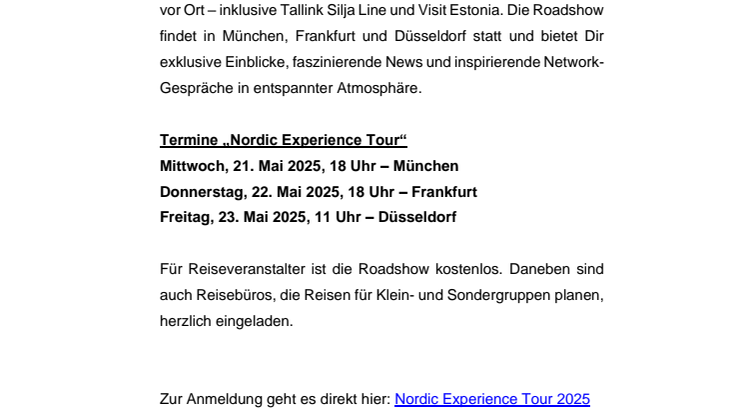 Begleite uns auf die „Nordic Experience Tour“ von Nordic Marketing und erlebe spannende Partner aus Skandinavien und Estland live vor Ort – inklusive Tallink Silja Line und Visit Estonia. Die Roadshow findet in München, Frankfurt und Düsseldorf statt und bietet Dir exklusive Einblicke, faszinierende News und inspirierende Network-Gespräche in entspannter Atmosphäre.
