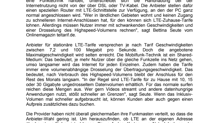 Anbieter für stationäre LTE-Tarife versprechen je nach Tarif Geschwindigkeiten zwischen 7,2 und 100 Megabit pro Sekunde. Doch die angebotene Maximalgeschwindigkeit wird selten erreicht. Die Mobilfunk-Technik ist ein Shared-Medium: Das bedeutet, je mehr Nutzer über die gleiche Funkzelle ins Netz gehen, umso langsamer wird das Internet für jeden Einzelnen. Zudem haben die Tarife immer eine volumenabhängige Drosselung der Übertragungsgeschwindigkeit. Das bedeutet, nach Verbrauch des Highspeed-Volumens bleibt der Anschluss für den Rest des Monats langsam. "In der Regel sind LTE-Tarife für zu Hause mit 10, 15 oder 30 Gigabyte ungedrosseltem Datenvolumen erhältlich. Für das normale surfen reichen diese Mengen aus. Wer gern Videos streamt und andere datenhungrige Anwendungen nutzt, stößt schneller an Grenzen", sagt Seute. Wenn das Inklusiv-Volumen mal schneller aufgebraucht ist, können Kunden aber auch gegen einen Aufpreis zusätzliches dazu buchen.